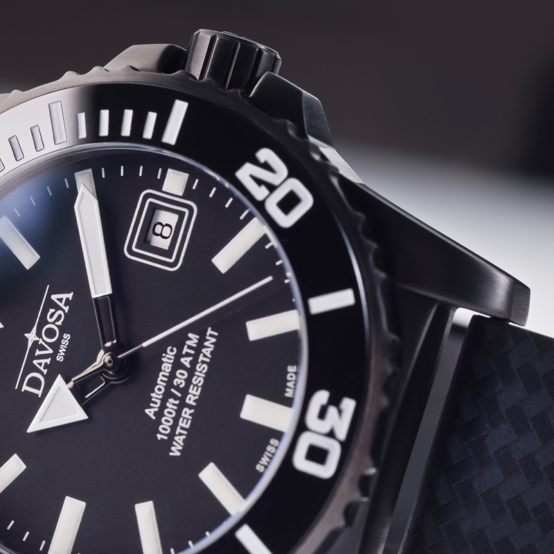 For decades Davosa Ternos model series has been known for its resilient stainless steel case, the tried and tested High-Tech ceramic bezel and a scratch-proof anti-glare sapphire crystal – bearing a pressure of up to 200 metres water column. The Ternos Professional range now boasts also a helium escape valve and water resistance to an impressive 500 metres.