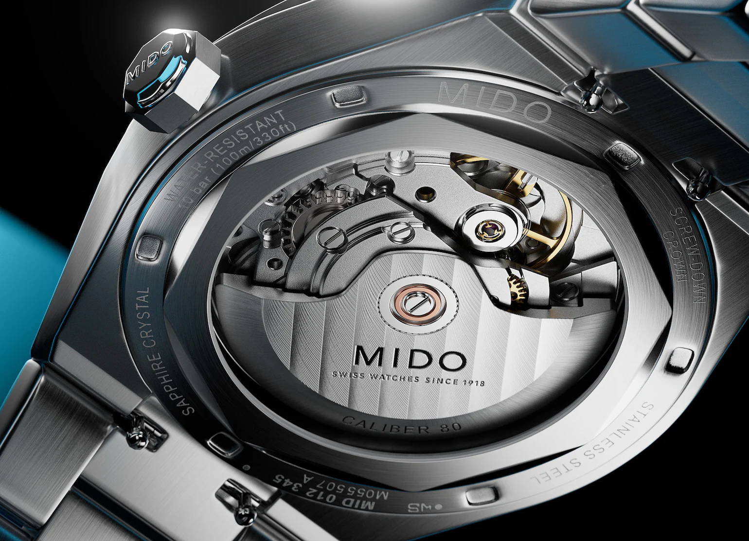 At the heart of the Multifort 8 One Crown beats the Caliber 80, delivering formidable precision. Its sublime mechanics are visible through the transparent case back, with the oscillating weight decorated with Côtes de Genève and engraved with the MIDO logo.
