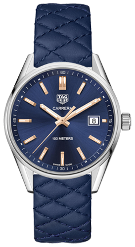 Simple, sophisticated style from the racetrack to your wrist. The Carrera Calibre 5 Day-Date automatic watch is effortlessly elegant. This 39mm Carrera Lady with a beautiful deep blue dial and blue calfskin strap which is padded with tone-on-tone stitching for a “haute couture” look, picks up on the same codes: the elegant case with faceted lugs and the clear, highly legible dial.
