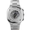 Case 42 mm in width. Satin-finished and polished steel. Screw-down crown. Sapphire case-back with a 360° oscillating weight.
