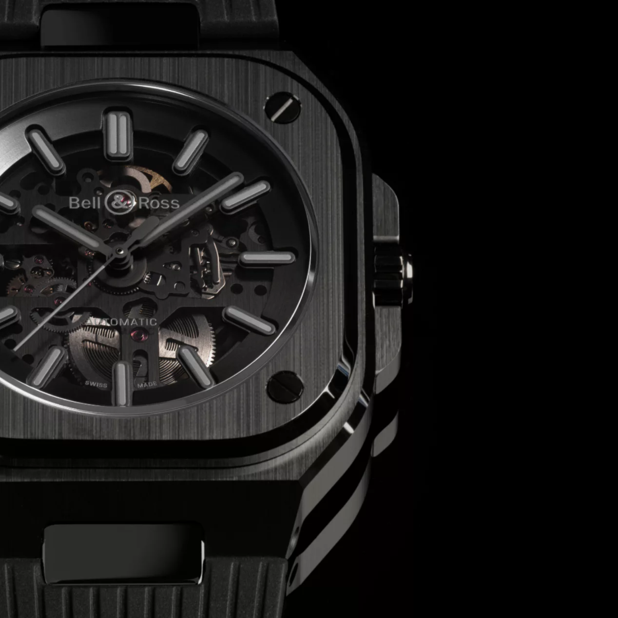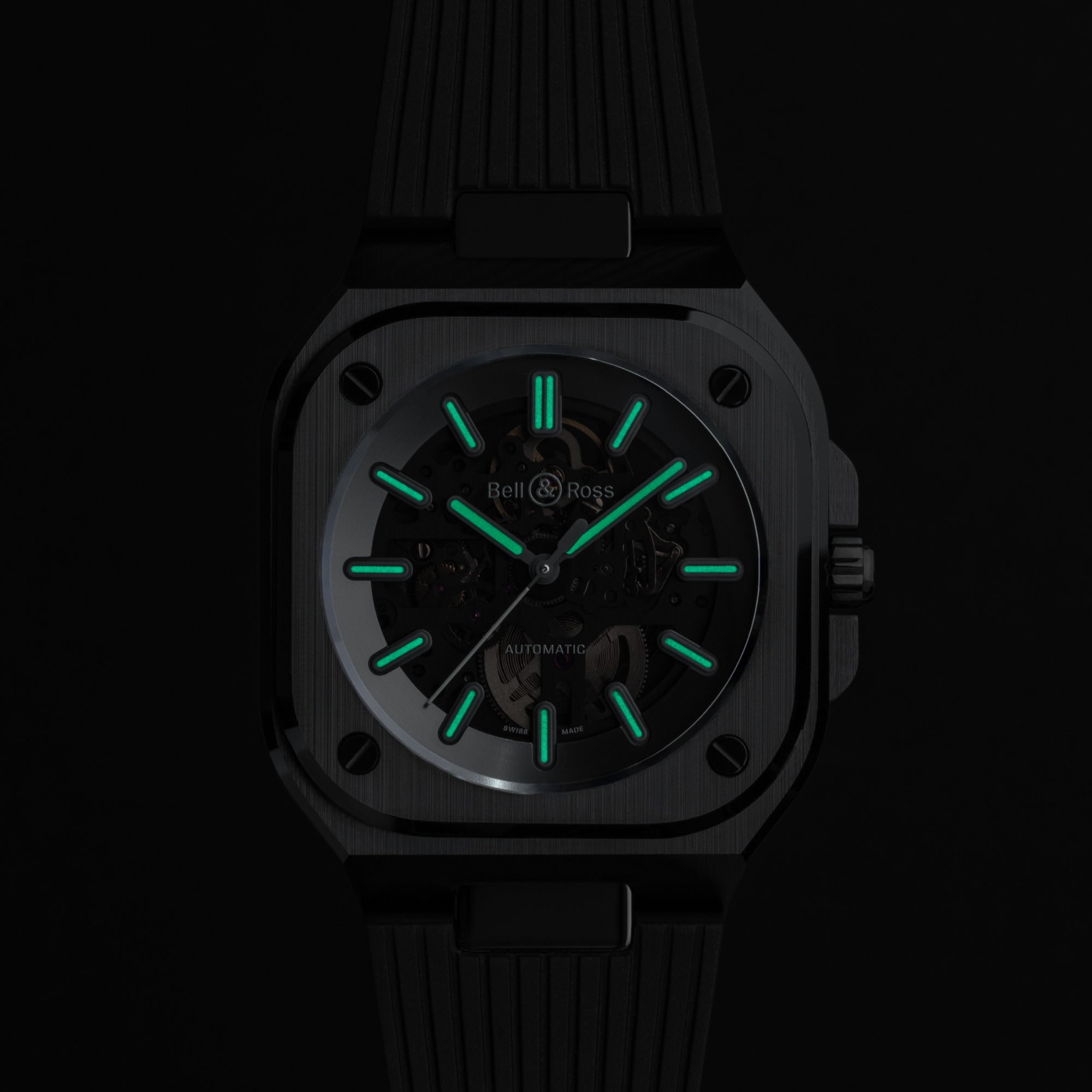 | DIAL | Skeletonised with a black tinted transparent plate and rhodium-plated movement. Applique indexes filled with Super-LumiNova® gray (green glow). Skeletonized hour and minute hands filled with Super-LumiNova® gray (green glow). Rhodium-plated second hand. |