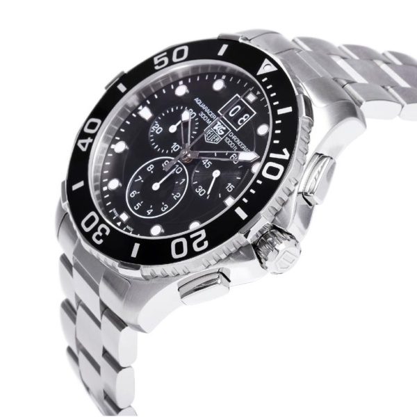 A 43mm quartz chronograph with full professional diving features. Heuer’s link to the high-pressure world of watersports began in 1895, the year it patented its first water-resistant case. The rugged, go-anywhere Aquaracer continues the legacy.