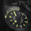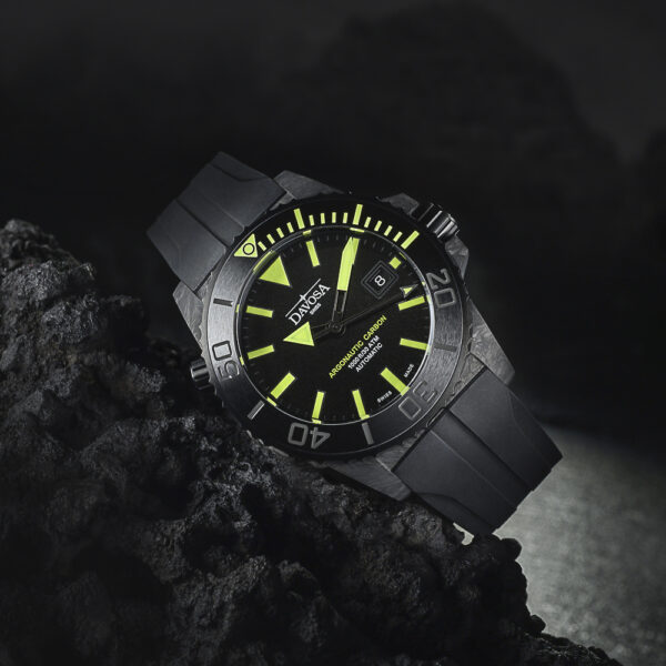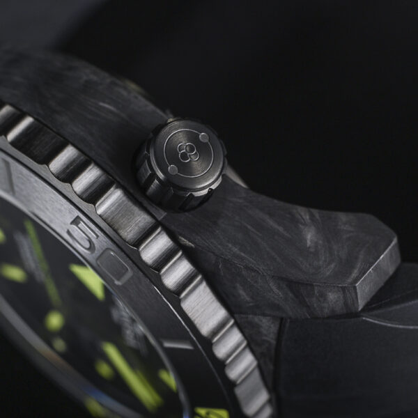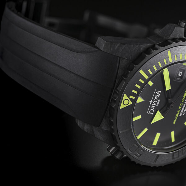 Forged carbon, individual carbon fibres combined with a composite material, is the defining case material. Under intense heat and pressure, a matt black blank[RAG1] is created from which the final case sculpture is formed, its velvety surface as unique as any fingerprint. Forged carbon is typically used in aviation and aerospace, and combines the exceptional qualities of metal and ceramic: making the case lightweight, highly resilient and extremely corrosion-resistant. The combination of a screw-down case back, which displays a historic diving helmet in relief as well as the limited edition number, a screw-in crown and a manual helium valve makes the watch water-resistant to a depth of 300 metres (30 ATM). Inside the case, a concealed DAV3021 Swiss automatic movement ticks away reliably.