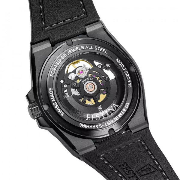 The Festina Swiss Made F22015/1 embodies the essence of modern Swiss watchmaking. Its black skeleton dial showcases the automatic movement with artisanal precision, reflecting the tradition of fine horology. The stainless steel case with a matte black finish conveys both strength and elegance. The sapphire crystal offers superior protection and lasting clarity. Luminescent hands and indices ensure perfect legibility, even in low light. The matte black leather strap with fine stitching provides comfort and distinction. Every detail of this model has been designed to deliver an incomparable Swiss watchmaking experience.