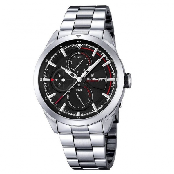 Sporty and elegant Stainless Steel multifunction watch with day-date-month and 24-hour indication 5 bar water resistance and a nice solid stainless steel bracelet.