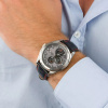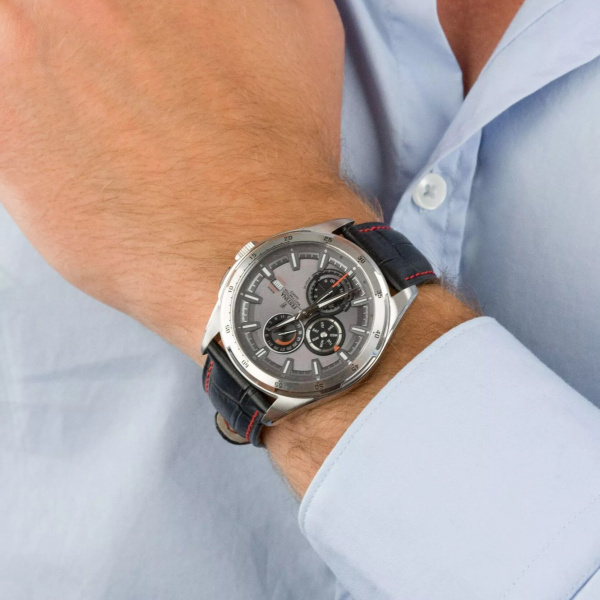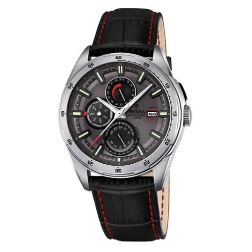 This intricate watch features a unique grey dial enclosed within a stainless steel case. The hints of red on the time piece and leather strap gives the design an added layer of depth. This watch also boasts many unique features, including month and date indicators.