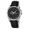 This intricate watch features a black dial enclosed within a stainless steel case. The hints of blue on the time piece and leather strap gives the design an added layer of depth. This watch also boasts many unique features, including month and date indicators.