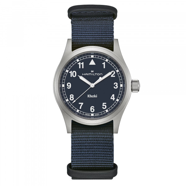 The Khaki Field Quartz expresses a return to Hamilton’s military heritage through simplicity in design. The dial features a clear typography with straighter Arabic numerals and a “railway” minute track. The color palette is understated, with its sleek blue dial highlighted by white Super-LumiNova® indexes. The watch comes with a blue textile NATO strap and blue leather loops – perfect for your next adventure out in the field.