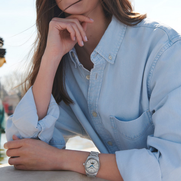 Functions Hours, minutes, seconds, moon phase display and date indicated by small hand at 6 o’clock