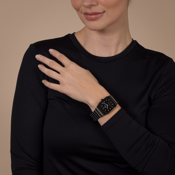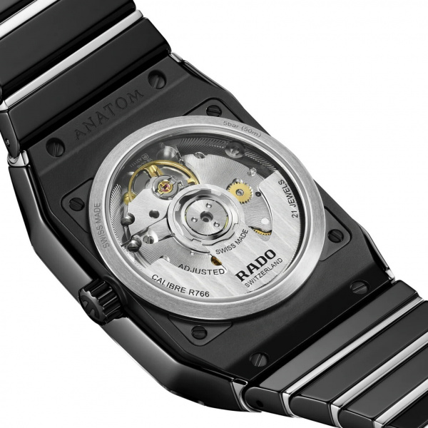 “Since its debut in 1983, the Rado Anatom has stood as a symbol of groundbreaking design and ultimate comfort. Its signature feature is the cylindrical metallised sapphire crystal with bevelled edges on both sides, extending seamlessly into the high-tech ceramic bracelet, creating a smooth, continuous form that merges the case and bracelet into a unified, cohesive shape. Crafted from polished black high-tech ceramic links and polished stainless steel middle links, the bracelet is meticulously secured by a brushed stainless steel 3-fold clasp.