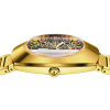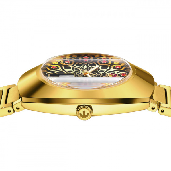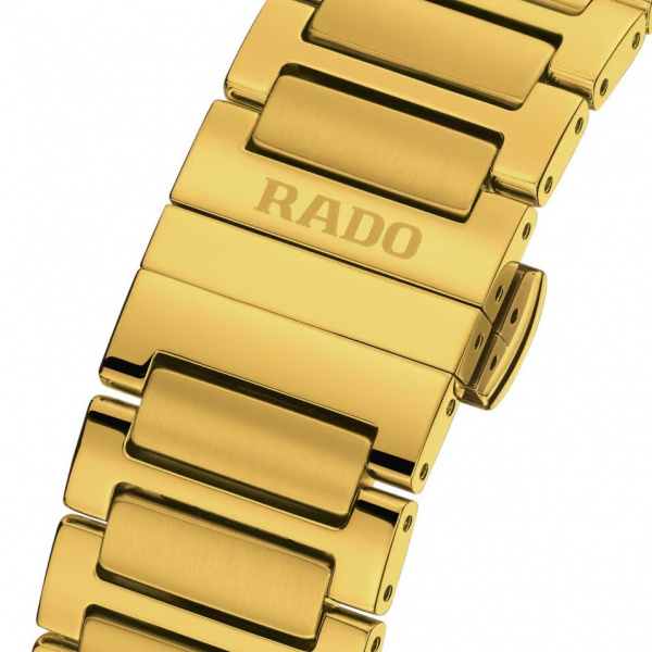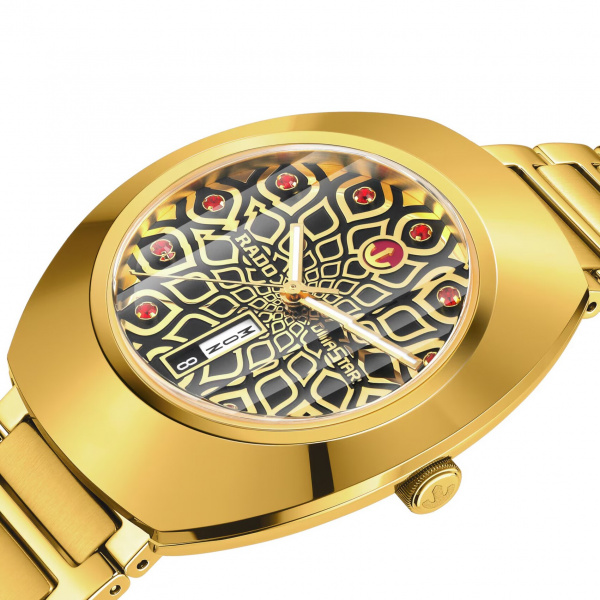 The unique DiaStar Original has a diameter of 38 mm and is water resistant down to 100 m. Framed by an ultra-shiny yellow gold couloured Ceramos™ coiffe with polished angles and detailing set over a matching, yellow gold couloured PVD coated stainless-steel case, this beautiful watch is rounded off with a vertical faceted sapphire crystal. Specifications include yellow gold coloured hands with white Super-LumiNova®, and a white day display and a black date display. The dial features eleven red cubic zirconia, on a yellow coloured harmonic pattern on a black coloured background. The Rado R764 automatic movement offers 80 hours of power reserve, with an antimagnetic Nivachron™ balance spring. The bracelet is made of yellow gold PVD coated polished and brushed stainless steel.