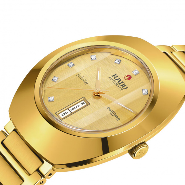 The unique DiaStar Original has a diameter of 38 mm and is water resistant down to 100 m. Framed by an ultra-shiny yellow gold coloured Ceramos™ coiffe with polished angles and detailing set over a matching, yellow gold coloured PVD coated stainless-steel case, this beautiful watch is rounded off with a parallel-stripe-faceted sapphire crystal. Specifications include a gold brushed dial with two directions, yellow gold coloured hands with white Super-LumiNova®, and a white day date display. The dial features eleven full cut diamonds, emphasised with the dark grey coloured printed “jubilé” logo. The Rado R764 automatic movement offers 80 hours of power reserve, with an antimagnetic Nivachron™ balance spring. The bracelet is made of yellow gold PVD coated polished and brushed stainless steel.