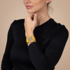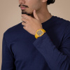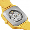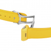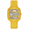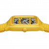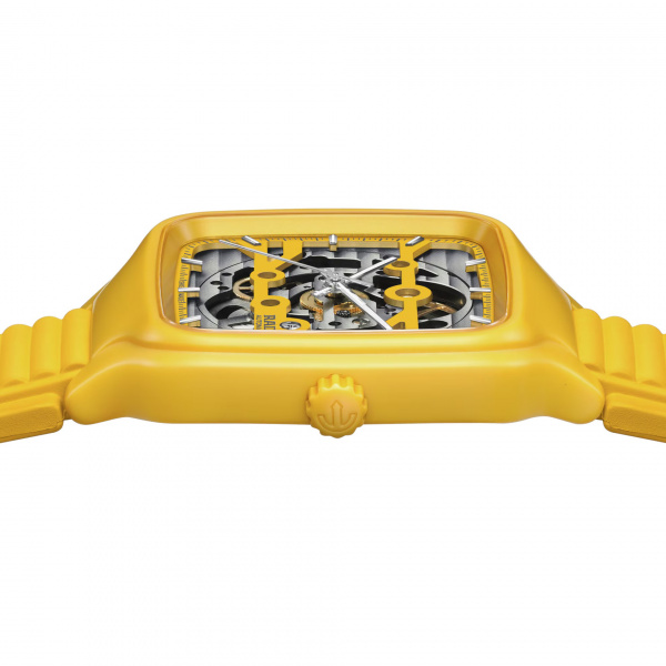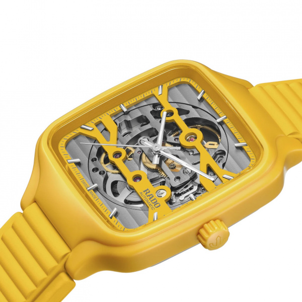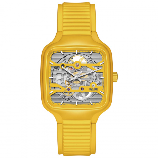 Experience the perfect fusion of artistry and precision with the True Square Skeleton. What catches the eye is the skeletonised movement R808 and the two-level dial, which practically merges with the movement. This state-of-the-art calibre delivers outstanding precision combined with enhanced resistance to magnetic fields with its reliable NivachronTM hairspring and has a power reserve of 80 hours. The skeletonised dial with sophisticated indices and hour/minute/second hands in rhodium tones, treated with white Super-LumiNova® for best readability in low-light conditions. With the 38mm monobloc case made of polished yellow high-tech ceramic and the bracelet made of yellow rubber, the True Square Skeleton presents characteristic Rado features in a fascinating form.