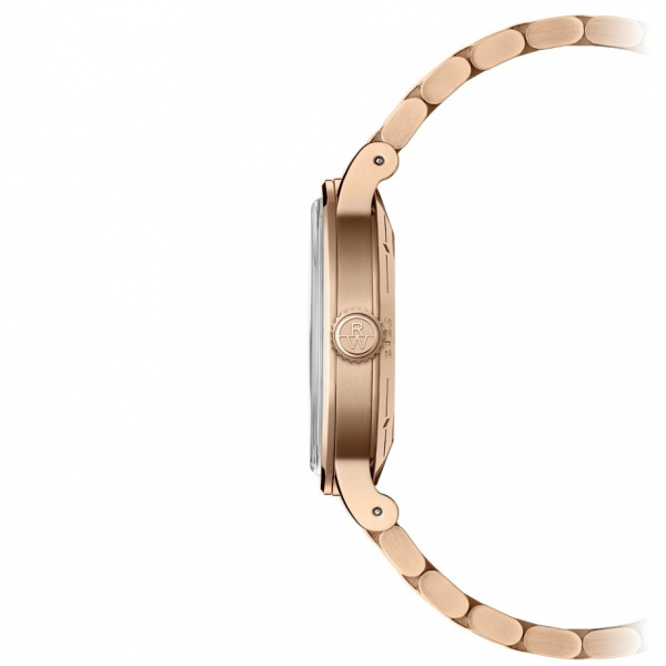 The stainless steel bracelet is enhanced with rose gold PVD coating.