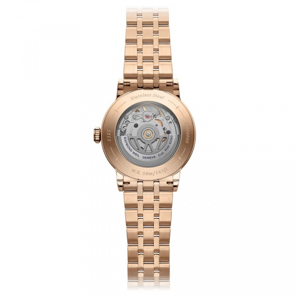 A sapphire caseback affords sight of the self-winding movement within and the “W-shaped” oscillating weight, RAYMOND WEIL’s horological signature.