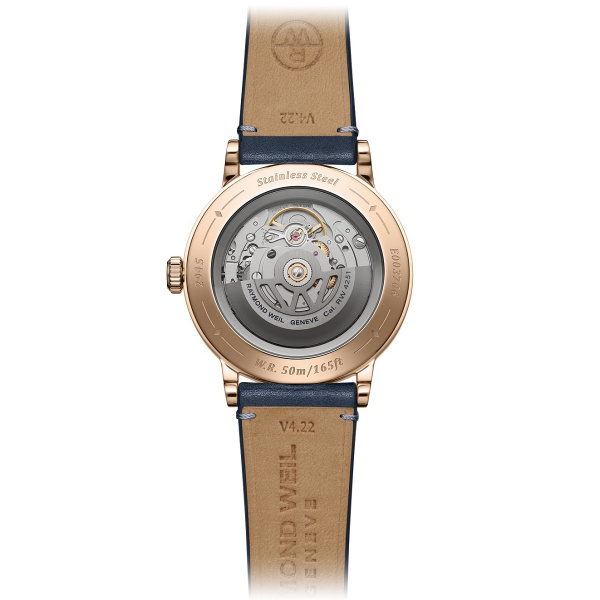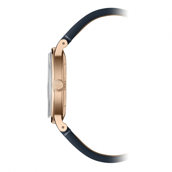 The bezel is decorated with a vertical satin-brush that contrasts wonderfully with the highly polished bevel nearby. This juxtaposition of two finishes reinforces the overall level of finishing. A sapphire caseback affords sight of the self-winding movement within and the “W-shaped” oscillating weight, RAYMOND WEIL’s horological signature. The navy blue genuine calf leather strap is enhanced with a unique W-stitched detail.