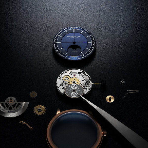 The millesime moon phase marks a fresh take on this iconic horological function: with its visually striking, sectorized dial, this model offers a reading of the lunar phases that is both dynamic and intuitive. The implementation of the moon phase, an emblematic watchmaking function, heralds a new face of creative elegance for RAYMOND WEIL.
