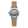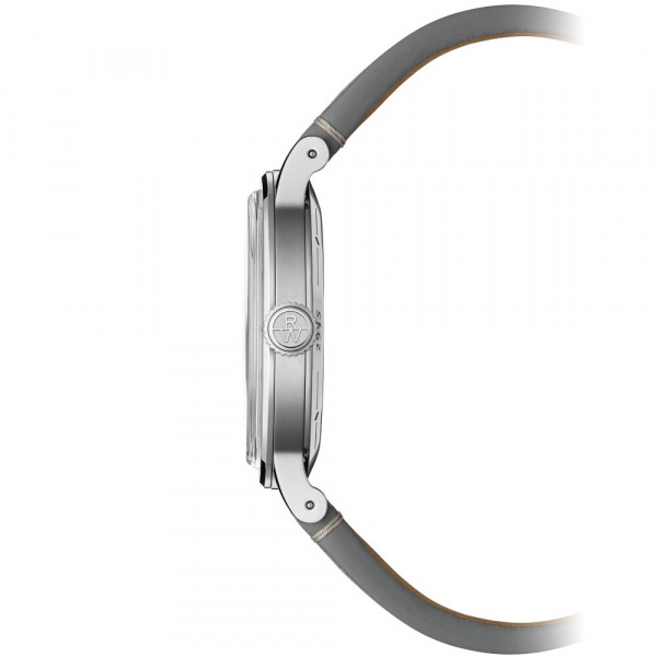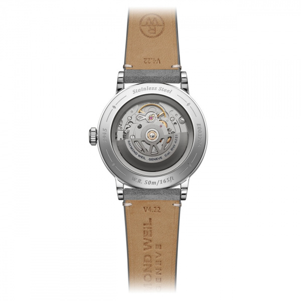 The bezel is decorated with a vertical satin-brush that contrasts wonderfully with the highly polished bevel nearby. This juxtaposition of two finishes reinforces the overall level of finishing. A sapphire caseback affords sight of the self-winding movement within and the “W-shaped” oscillating weight, RAYMOND WEIL’s horological signature. The grey genuine calf leather strap is enhanced with a unique W-stitched detail.