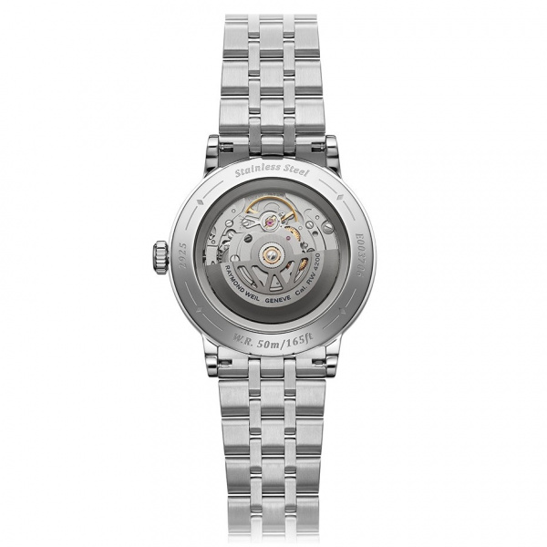 A sapphire caseback affords sight of the self-winding movement within and the “W-shaped” oscillating weight, RAYMOND WEIL’s horological signature.