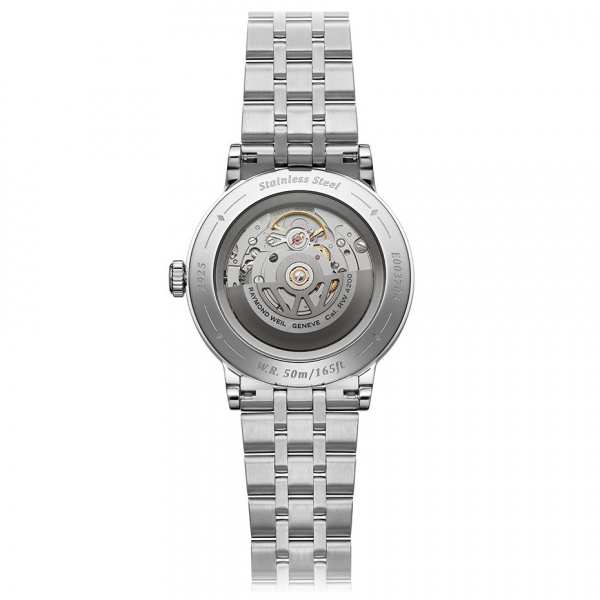 A sapphire caseback affords sight of the self-winding movement within and the “W-shaped” oscillating weight, RAYMOND WEIL’s horological signature.
