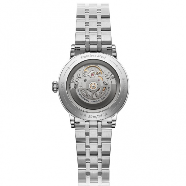 The millesime features a small seconds display at 6 o’clock, delineated with a neat recessed circlet, introducing a seemly play with depths, which is enriched with a tasteful selection of details. The bezel is decorated with a vertical satin-brush that contrasts wonderfully with the highly polished bevel nearby. This juxtaposition of two finishes reinforce the overall level of finishing. A sapphire caseback affords sight of the self-winding movement within and the “W-shaped” oscillating weight, RAYMOND WEIL’s horological signature.