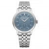 The denim blue dial, located beneath a vintage-inspired sapphire crystal glass-box, has been refined to the highest degree. The hours and minutes are eloquently conveyed with silver-toned hands, lined with Super-LumiNova®. The sector dial presents the hours, minutes and seconds periods on discrete tracks, augmenting readability. A closer inspection of the dial reveals contrasting finishes, the hour track is smooth, the minute track is snailed and the central area of the dial is adorned with a delicate vertical brush.