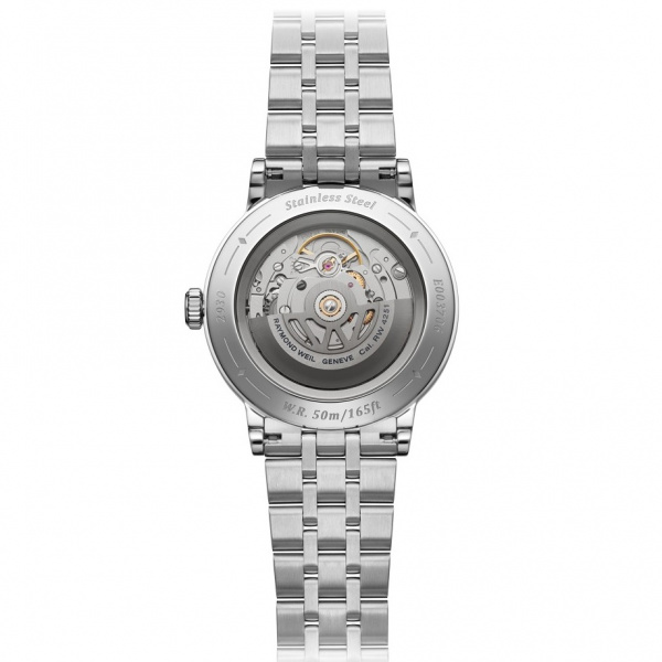 The millesime features a small seconds display at 6 o’clock, delineated with a neat recessed circlet, introducing a seemly play with depths, which is enriched with a tasteful selection of details. The bezel is decorated with a vertical satin-brush that contrasts wonderfully with the highly polished bevel nearby. This juxtaposition of two finishes reinforce the overall level of finishing. A sapphire caseback affords sight of the self-winding movement within and the “W-shaped” oscillating weight, RAYMOND WEIL’s horological signature.