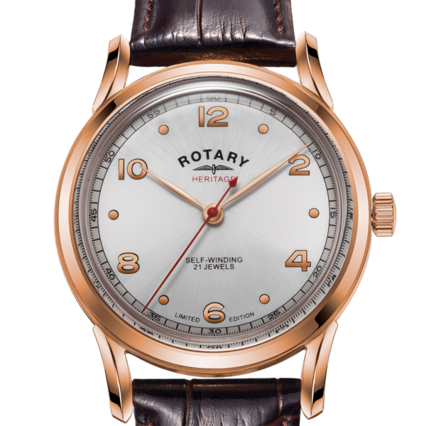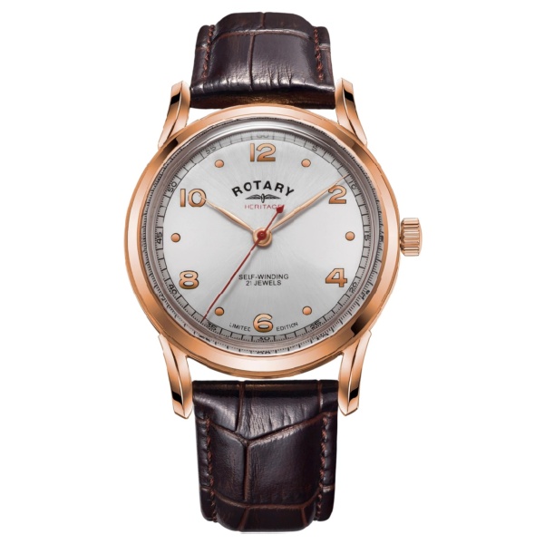 In celebration of Rotary Watches 125th Birthday in 2020, Rotary have delved into the archives to bring together a celebration of heritage and iconic design. Limited to just 300 pieces, this timepiece possesses effortless style and timeless character. This timepiece features elements of watch design made prevalent in the 40s, whilst prominent lugs and polished Arabic dial markers deliver a contemporary twist to the classic design. A 40mm stainless steel Rose Gold PVD case is enclosed in bubble mineral glass, an element from the original design. The combination of a brushed silver-white dial with brown leather straps and Rotary Buckle evokes the popular aviation style of the era. Water resistant to 50M and featuring a domed dial this timepiece is perfect for the avid collector, or those looking to begin their collection.