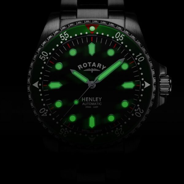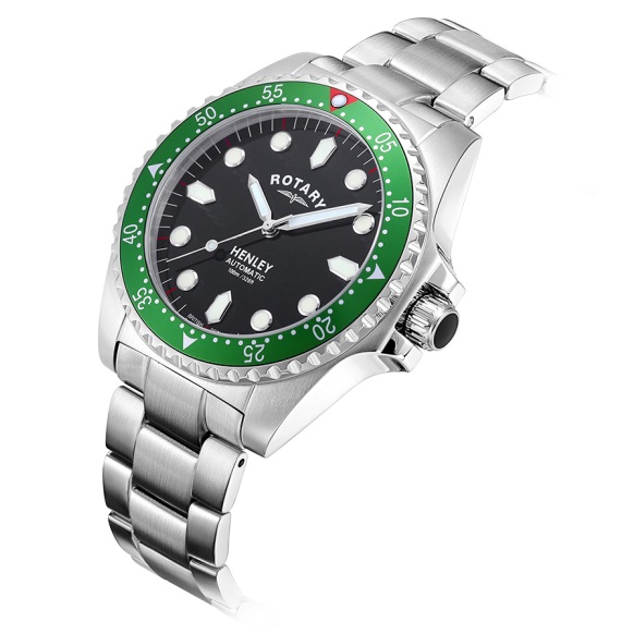 The ultimate diver’s watch in Rotary’s portfolio, this Henley model is water resistant to 100m and features a red marker on the statement green bezel for easy reading. Additional dual colour luminosity is achieved on markers and hands, contrasting against the black dial and Stainless Steel 41mm case. The integrated automatic movement makes it perfect for wearers on the go.