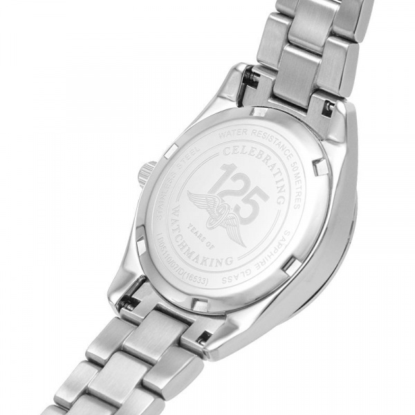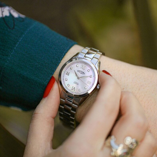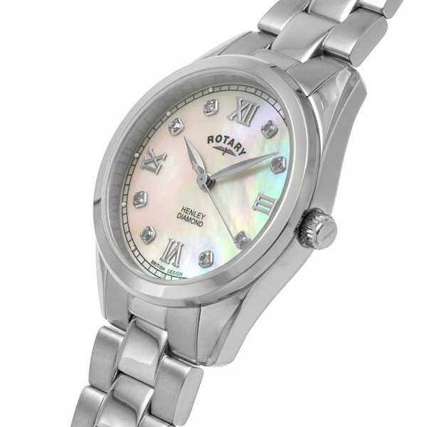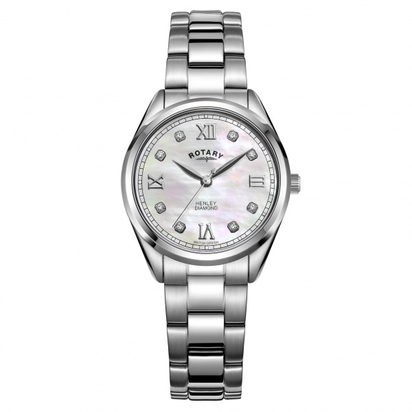 An elegant example of contemporary design paired with traditional craftsmanship, this ladies watch from our Henley collection is vibrant and versatile. Built with a sturdy 30mm Stainless Steel case, the watch is powered by a high quality quartz movement. 8 diamond hour markers and Roman numeral quarter hour markers add an element of undeniable glamour, whilst the 3-link Stainless Steel bracelet delivers a powerfully simple statement. A shimmering pink mother of pearl dial delivers an extra element of luxurious styling and perfectly complements the diamond hour markers. Water resistant to 50m and featuring flat scratch-resistant sapphire glass to keep you watch protected in times of activity, this Rotary adapts to the modern woman.