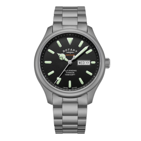 A unique design in Rotary’s Heritage collection, this limited edition watch offers nostalgic appeal. Automatically powered with a 42mm titanium case and bracelet, this timepiece features luminescent hour markers and hands that contrast against the black dial and complement the date window.
