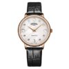 With a mother of pearl dial displaying 12 Swarovski crystal hour markers, all protected beneath sapphire glass, this quartz watch is an elegant timepiece from our Kensington family. The 35mm Rose Gold PVD Stainless Steel case goes well with the black leather strap to provide a timeless look.