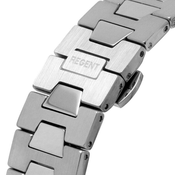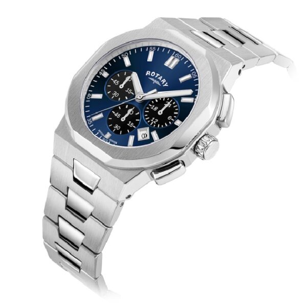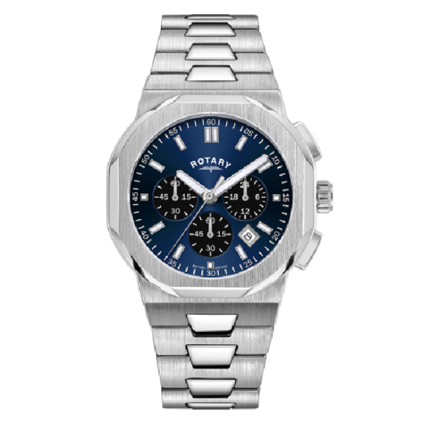 This Regent watch is crafted with a multi-facetted brushed stainless steel 40mm case and tapered h-link bracelet. The watch showcases a blue sunray dial that features its chronograph function, luminous applied hour markers and a date window. Water resistant to 100m, this Regent is powered by a quartz movement. Made with scratch resistant sapphire glass, perfect for every day use.