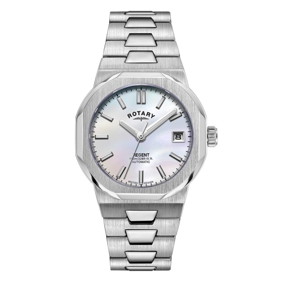 This timepiece features the signature Regent multi-facetted brushed stainless steel case with a 36mm diameter and tapered h-link bracelet. The white mother of pearl dial displays applied luminous index markers and a date window. Water resistant to 100m, Regent is powered by an automatic movement that makes it perfect for everyday use. Made with scratch resistant sapphire glass.