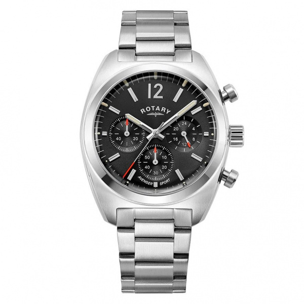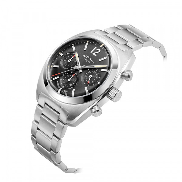 Carrying a racing retro aesthetic, this Rotary Sport features a stainless steel 40mm vintage look case which frames the black dial chronograph. Bubble mineral glass married with the smooth dynamic curved side of the case reinstates a nod to the past. This timepiece features applied indices and Arabic numerals at 12; with a 3 link stainless steel bracelet.