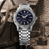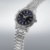 Enclosed in compact case, the navy-coloured dial is a base for 60s-style indices, each with sharp multi-faceted surfaces for added light reflection. The bezels and lugs are mirror-finished for contrasting elegance. The bezel is engraved with arabic numerals for legibility. It has a multi-row five-link bracelet, with hairline and mirror finishing, to enhance the interplay with the light, and sparkle.