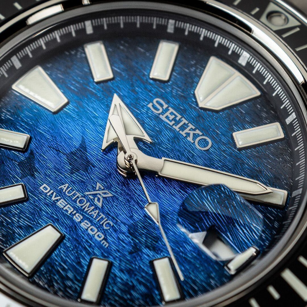 This Prospex watch is from Seiko’s ‘Save The Ocean’ collection. The dial of this special edition timepiece represents the view of the ocean as seen by the 5m deep vision of the Manta Ray endangered species. Its colours echo the gradations of sunlight refraction and the patterns symbolise waves seen from under the sea. This model features a ceramic black bezel and Sapphire crystal. Seiko donates proceeds from Save The Ocean models to sea conservation organisations. Comes with special edition ‘Save the Ocean’ box.