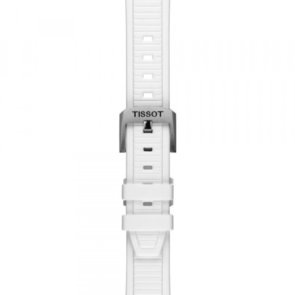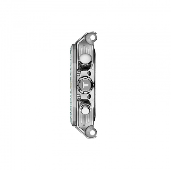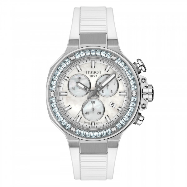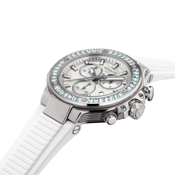 Tissot has drawn inspiration from its partnership with motorcycle racing to create a watch that reflects the dynamism of motorcycles and the emotion of the sport… The T-Race collection immerses the wearer in a mechanical environment and awakens the spirit. The bezel resembles a brake disc decorated with glass ceramic, the pushers are inspired by handlebars, and the cooling fins of an engine are reproduced on the side of the case. The watch is water-resistant to 10 bar (100 m) and equipped with a quartz chronograph movement.