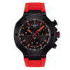 With its new design, including a more elevated dial, the Tissot T-Race Chronograph gets more elegant without denying its sporting roots. Inspired by the partnerships between Tissot and motorcycle racing, the T-Race Chronograph reflects the dynamism of motorcycles and the emotion of the sport. The watch is water-resistant up to a pressure of 10 bar (100 m), equipped with a quartz chronograph movement and features hour and minute hands coated with SuperlumiNova. The scratch-resistant, anti-reflective sapphire crystal guarantees enhanced robustness. This version of the Tissot T-Race Chronograph features a black PVD-coated stainless steel case, a black dial with red accents and a matching rubber strap.