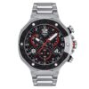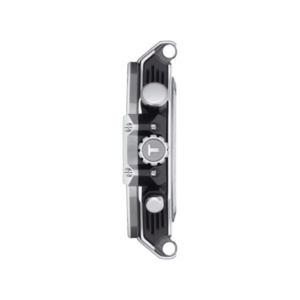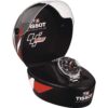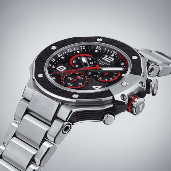 Put yourself on the road to freedom with the T-Race MotoGP Quartz. It is the perfect way of showcasing your passion for riding. There are several stunning design features that allude to life on two wheels: the bezel, and crown protection resemble a brake disc and its jaw, while the grooved middle band of the case side is reminiscent of the cooling fins of an engine, and the pushers of handlebars. Powered by accurate chronograph quartz movement, its dial is made of technical carbon fibre. Limited to a run of 8000, even the box rocks, with its helmet packaging. Perfect timing with a sporty edge.
