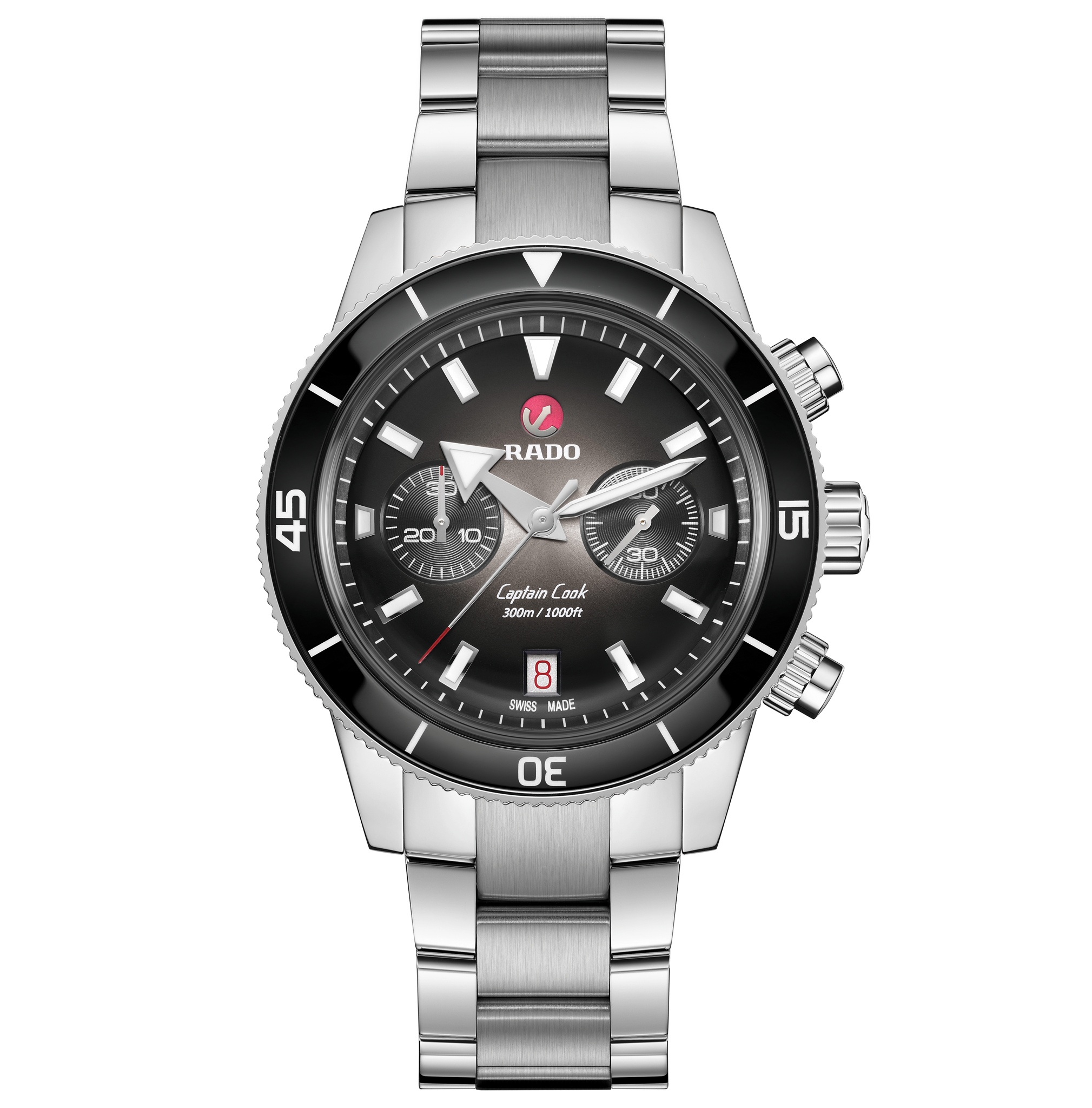To keep everything together, the new Captain Cook Chronograph comes in a special case inspired by the built-to-last, two-strapped treasure chests of ancient explorers and navigators. Protected by a tough, black diver-nylon outer covering, the wooden (FSC) box is equipped with metal hardware, around a soft ivory coloured interior where your spare straps can be safely stored, along with your favourite Rado, when not in use. All done with irresistible good taste and uncompromising precision.