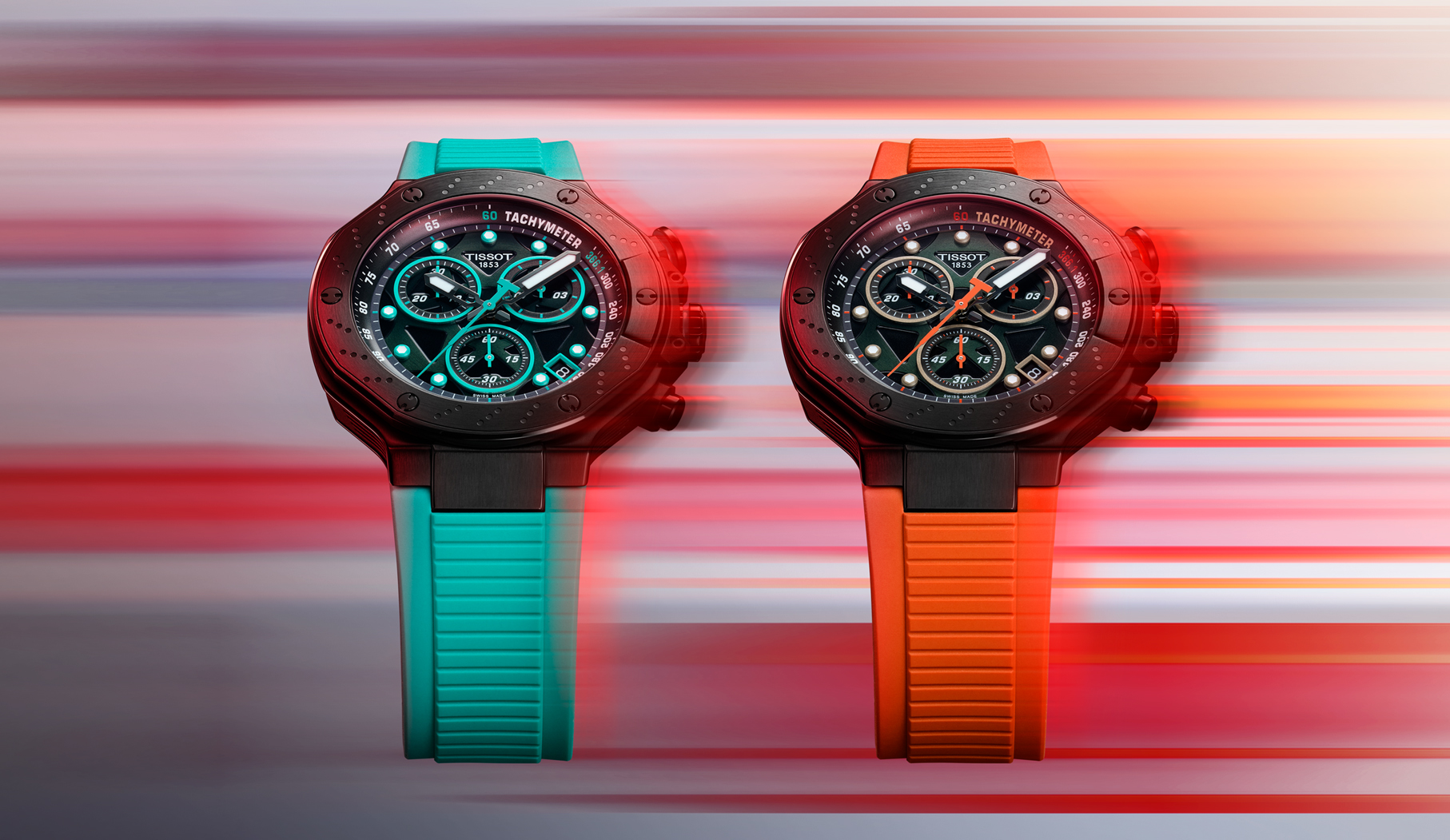 Shifting gears from the MotoGP editions, the T-Race Quartz Chronograph expands its lineup with two 45mm colourways: turquoise green and orange, both paired with a black PVD-coated case. These striking contrasts bring a new edge to the collection.