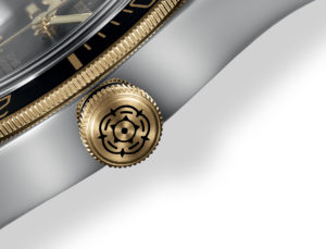 | WINDING CROWN | Yellow gold screw-down winding crown, with the TUDOR rose engraved and lacquered in black, with black anodised aluminium winding crown tube |
